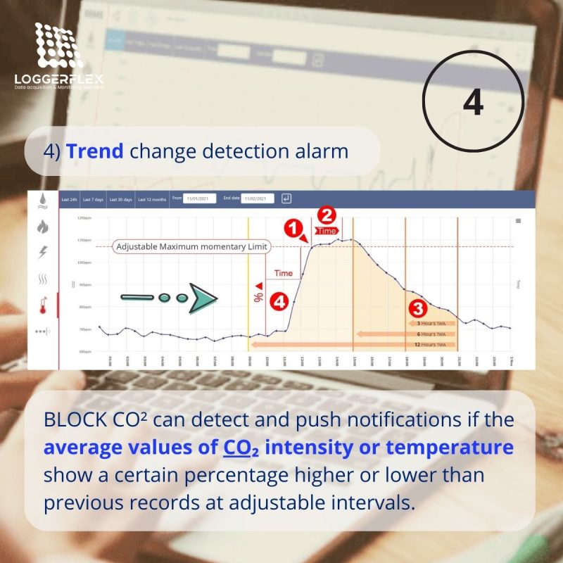 ‘BLOCK CO₂’ can monitor the trend of changes or drift in measurements and push notifications if the average values of CO₂ intensity or temperature show a certain percentage higher or lower than previous records at adjustable intervals.