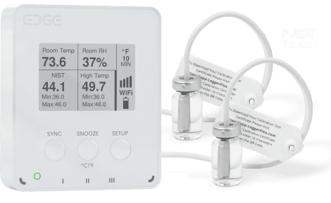 EDGE Lite monitors ambient temperature and one external temperature probe (optional NIST certificate), featuring Min/Max display, audible alarms, and a snooze button.